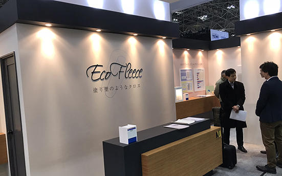 その住宅内装に向けて新たな角度でペイント仕上げを普及させようとしているのが輸入建材商社のナガイだ。同社が出展していた「エコフリース」は塗装下地壁紙「ルナファーザー」にペイントをプレコートした新たな壁紙。自然素材や透湿性などの環境性能とともに、光の優しい反射や揺らぎ感、優しい風合いなど上質なインテリアを演出する『ルナファーザー+塗装』ならではの魅力を訴求。「塗装にはビニールクロスが及ばない良さがあり、そこに気づく人たちが増えてきている。プレコートのため現場では塗装レスなので価格も比較的リーズナブル。店舗関係だけでなく住宅建築からも強い引き合いがある」(担当者)と内装シーンにおけるペイントの可能性を示唆。