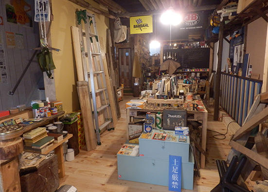 2階は小笠原氏の住居スペースでここも全体をリノベーション。木製パレットを再利用して作ったテーブル、単管パイプで組んだバーコーナー、トタンを貼った壁、エイジング塗装を施した建具などなど、やはり懐かしさとカッコ良さが融合した個性的な空間が広がっている。
