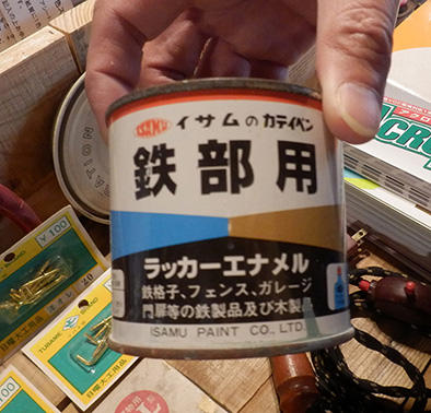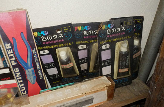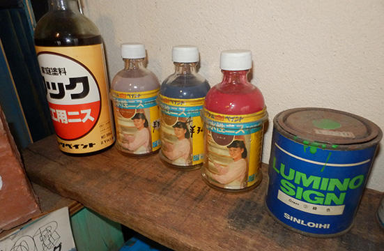 ノコギリ、レンチ、ドライバー、バイス、スケール...昭和の時代に活躍していた物づくりの道具や工具、金物、古材などが所狭しと並んでいる。「イサムのカテイペン鉄部用」や「アトムハウスペイント水性ニス」「ロック木工用ニス」「アサヒペン色のタネ」など、やはり昭和の頃に売られていた塗料も数多く陳列。業界人にとっても興味が尽きない空間になっている。
