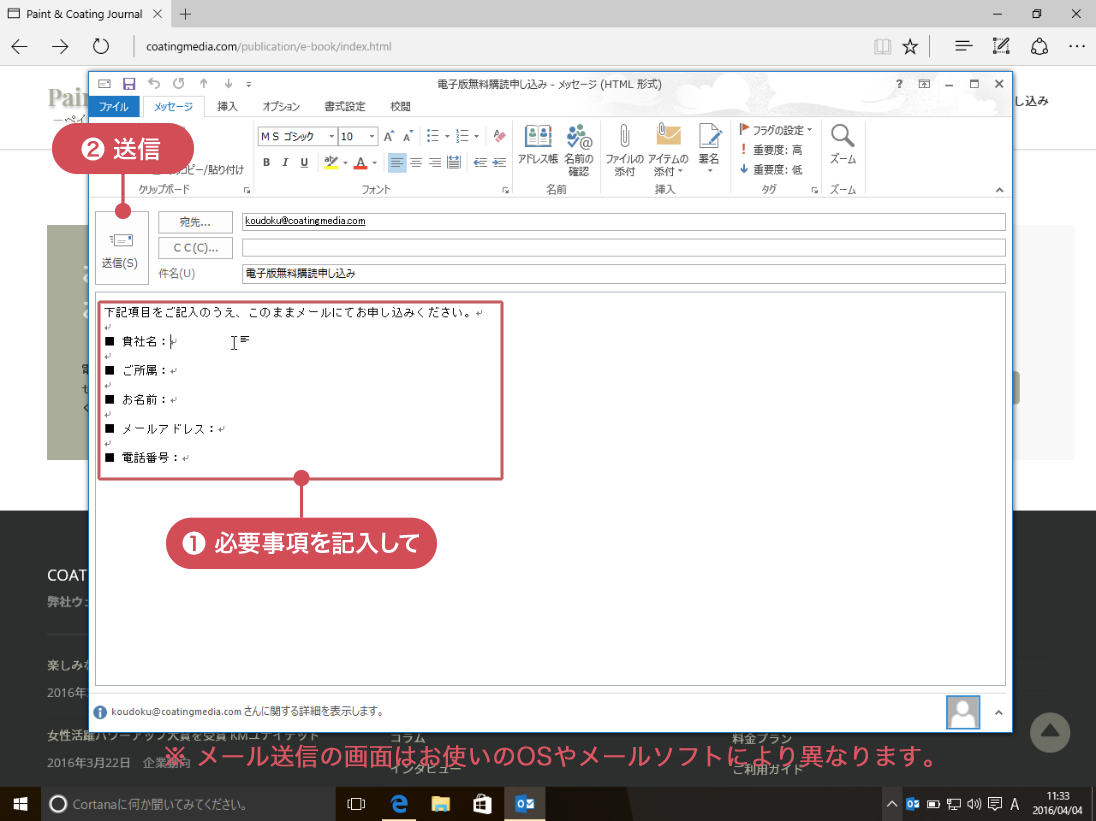 このページ下部の「お問い合わせ・お申し込み」欄内の[無料購読申し込み(現在、新聞を購読されている方)]ボタンをクリックしてメーラーを起動します。