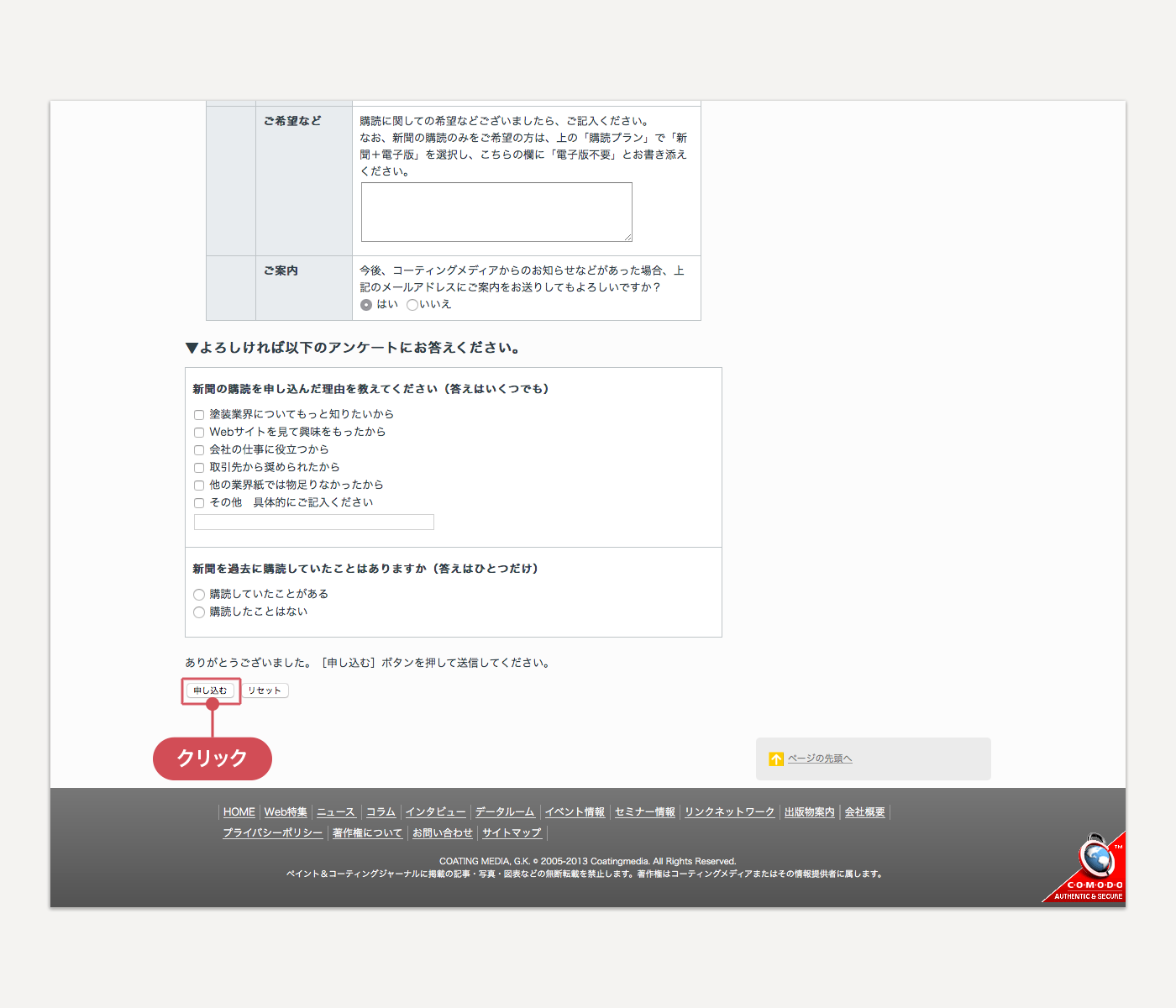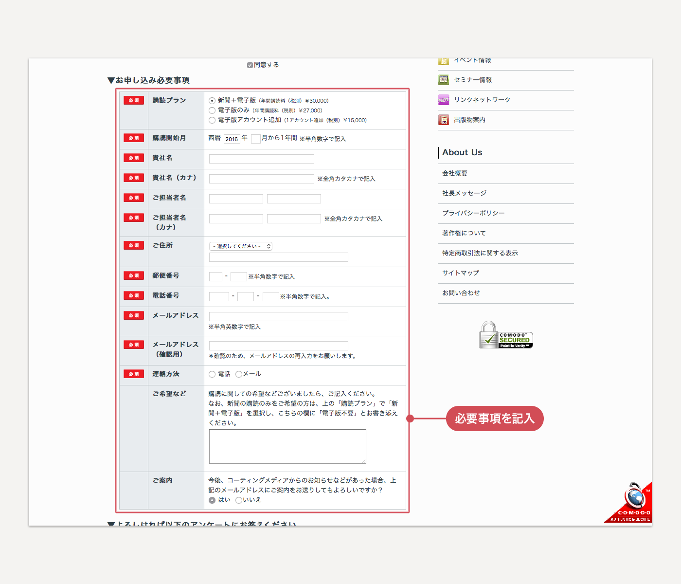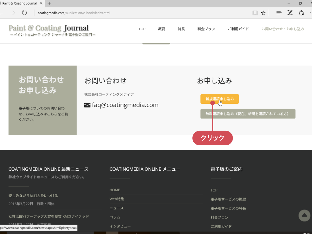 このページ下部の「お問い合わせ・お申し込み」欄内の[新規購読申し込み]ボタンをクリックすると、新聞購読申し込みページにアクセスできます。