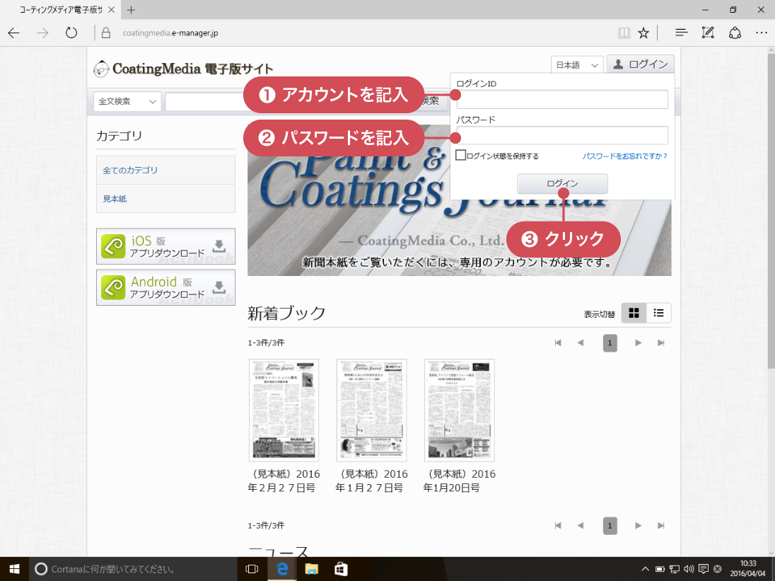 お申し込み後にお届けするメールに記載のURLにアクセスすると CoatingMedia電子版サイト のトップページが開きます。