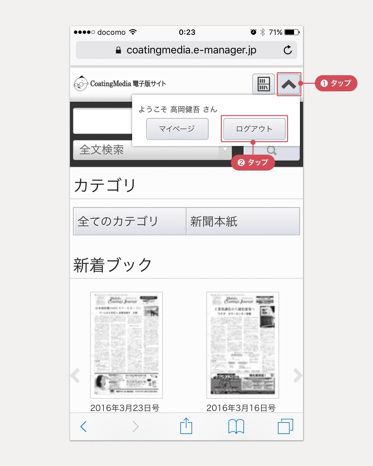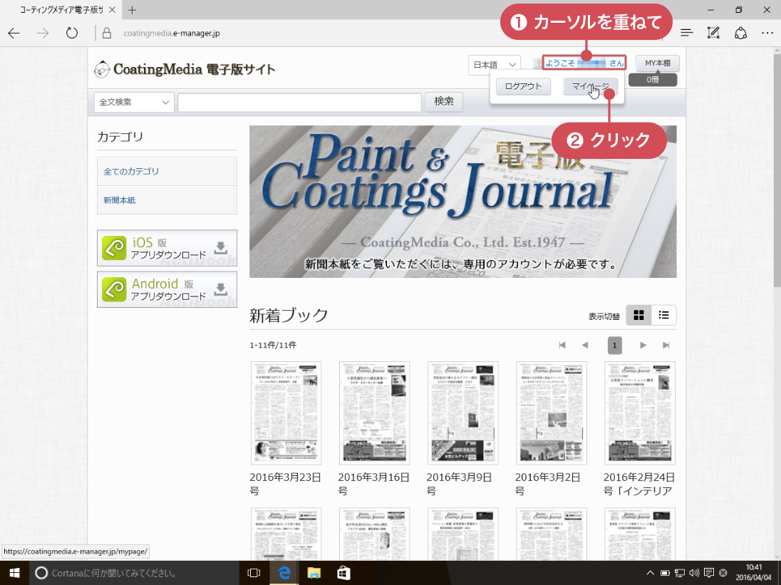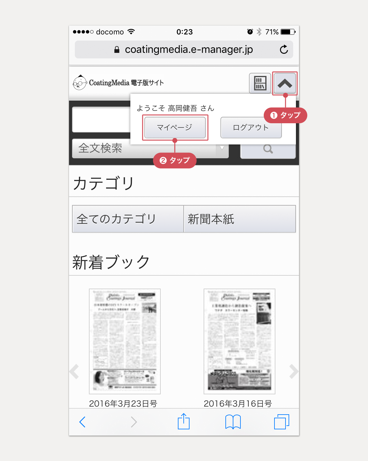 ※ [マイページ]からトップページにもどるには、画面左上の[CoatingMedia 電子版サイト]のタイトルか、ページ末尾の[HOME]をタップします。