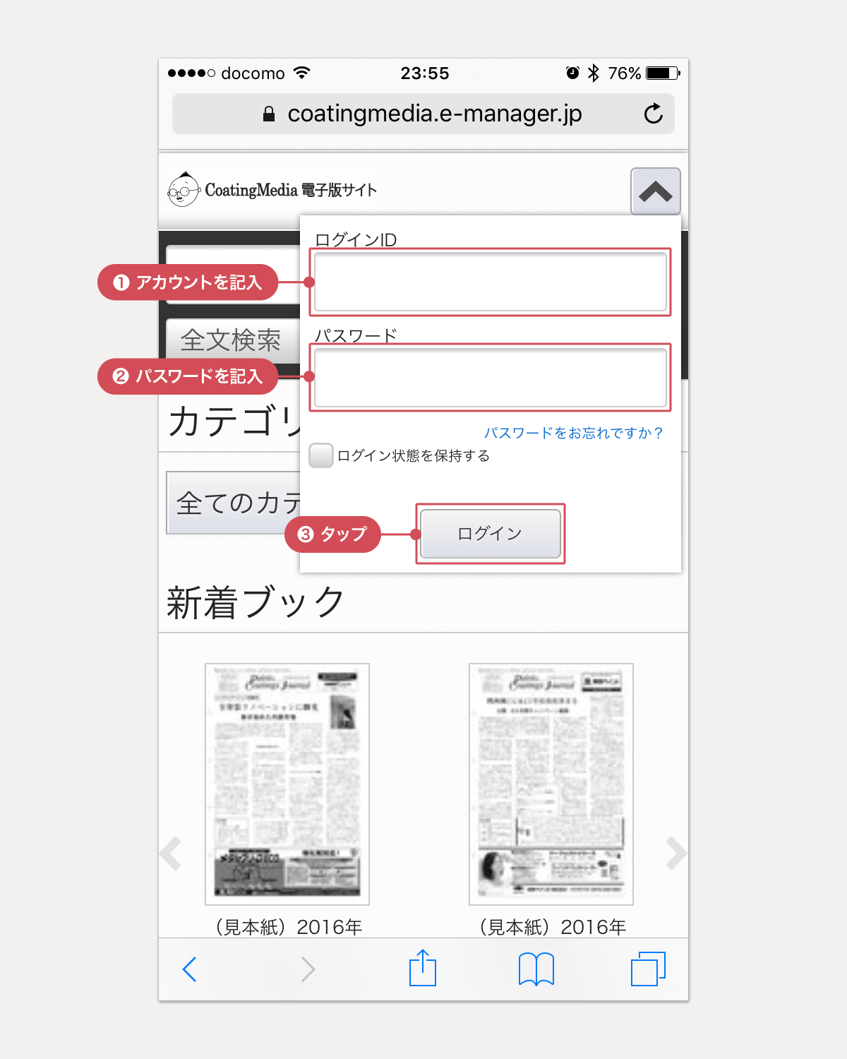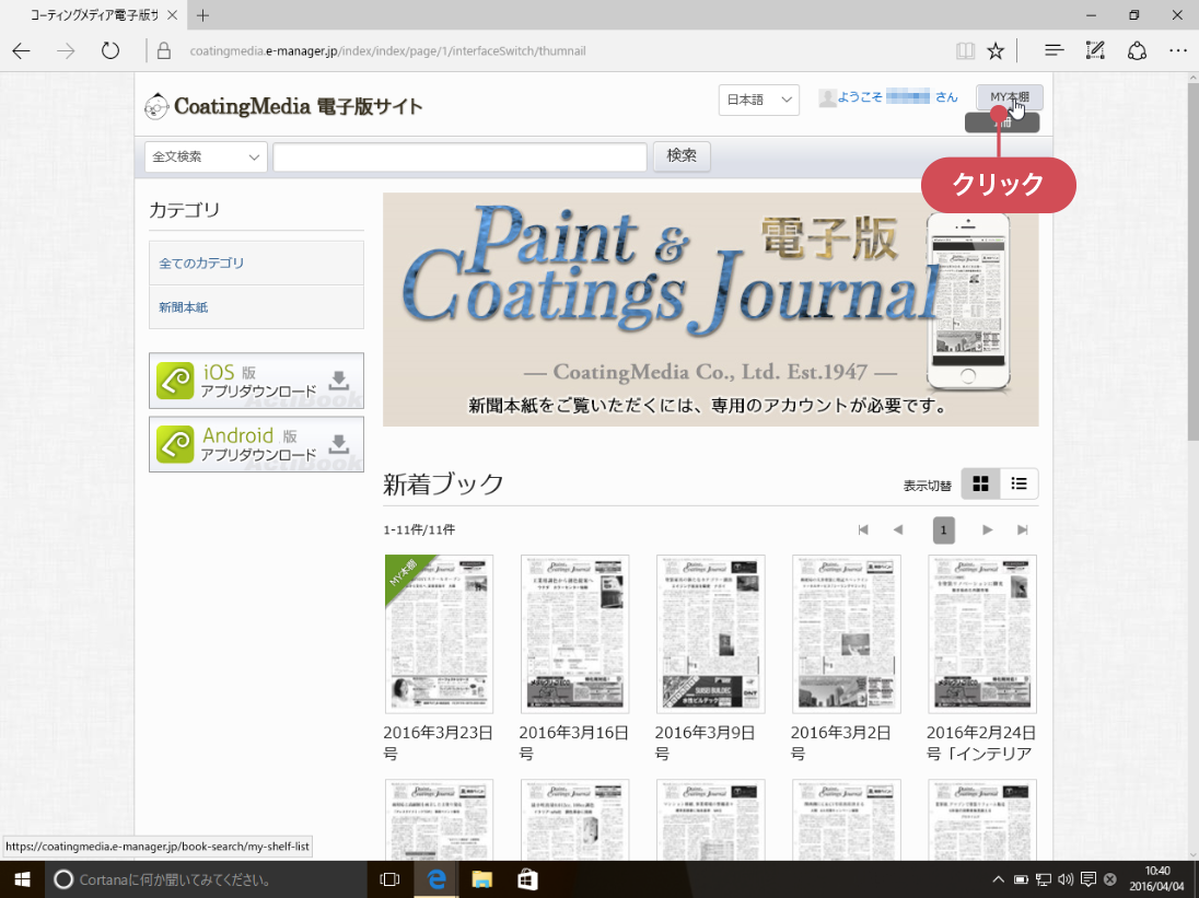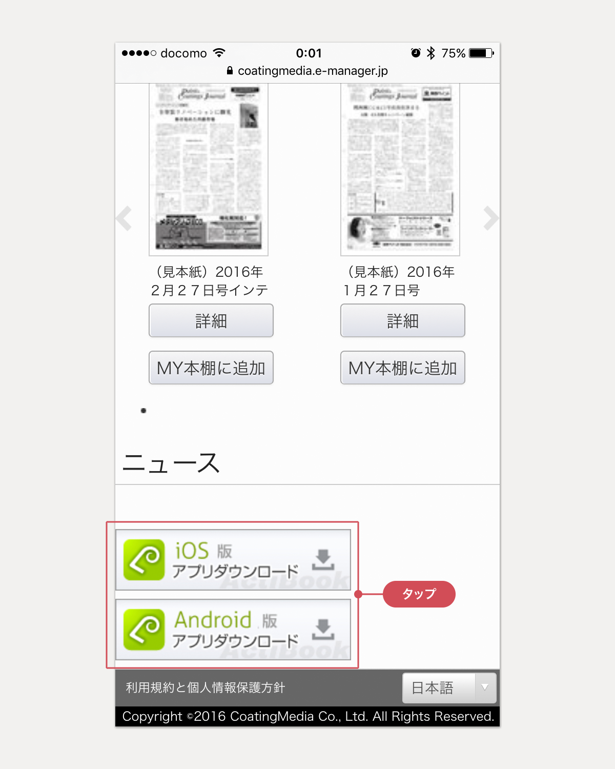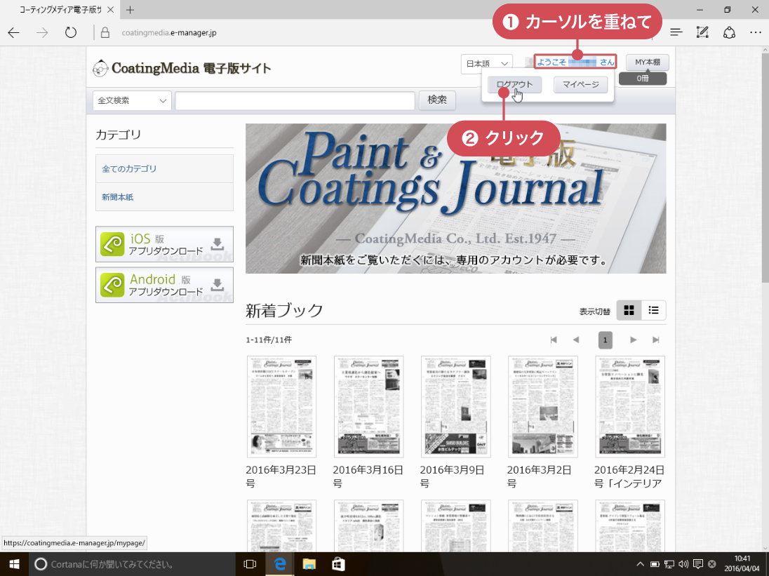※ [マイページ]からトップページにもどるには、画面左上の[CoatingMedia 電子版サイト]のタイトルか、ページ末尾の[HOME]をタップします。