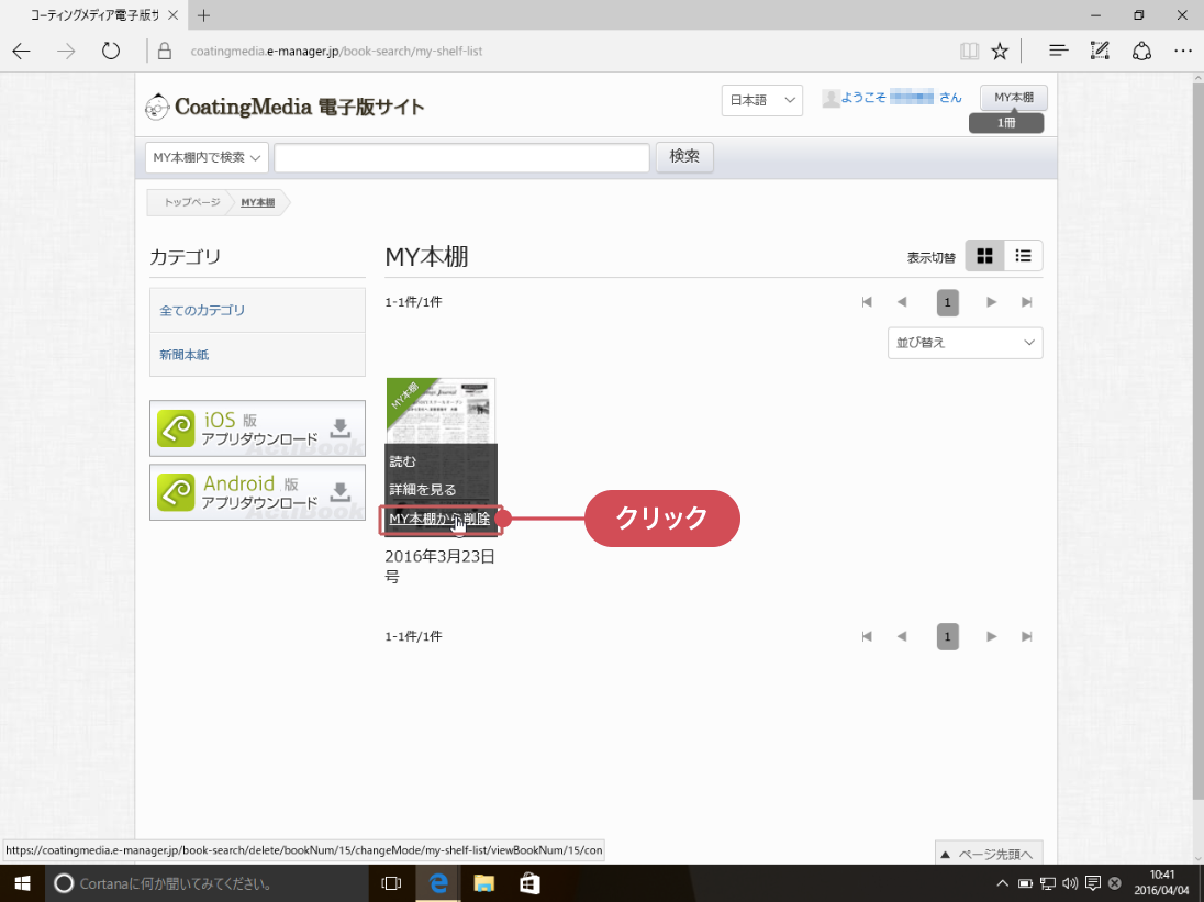 ※ MY本棚から削除したいときには、削除したい電子版のイメージにカーソルを重ねて[MY本棚から削除]をクリックします。