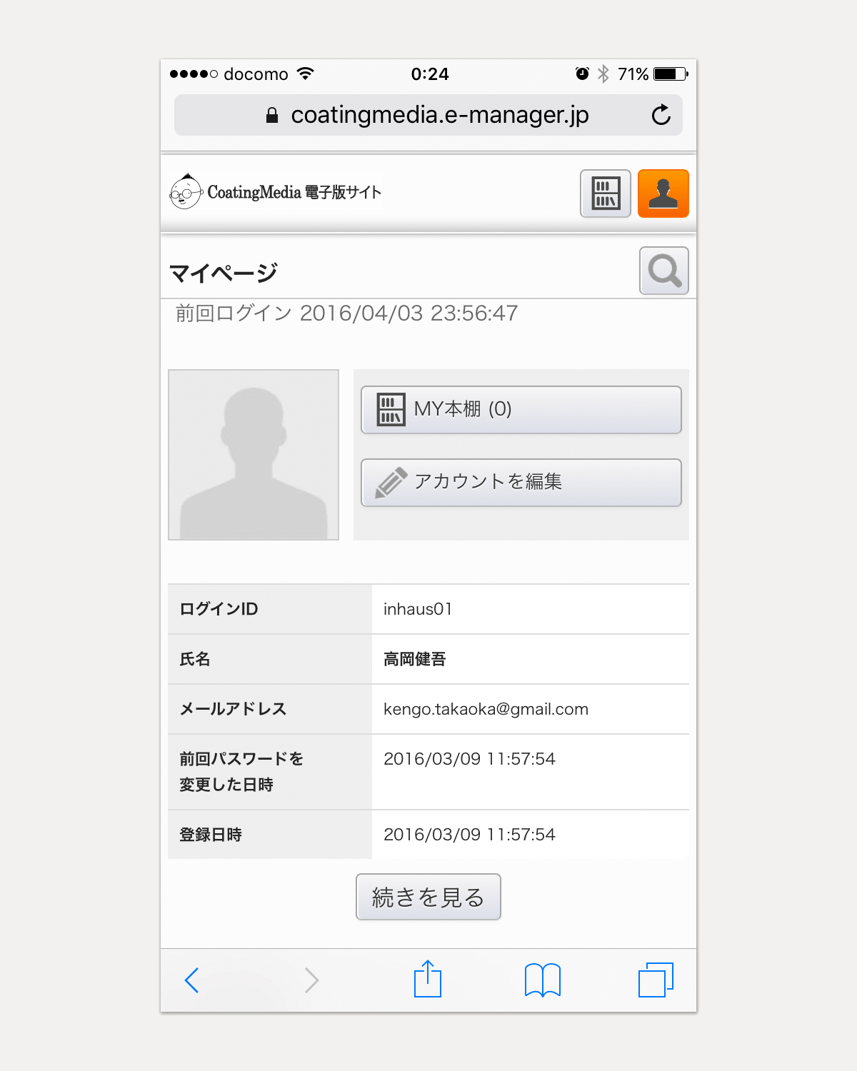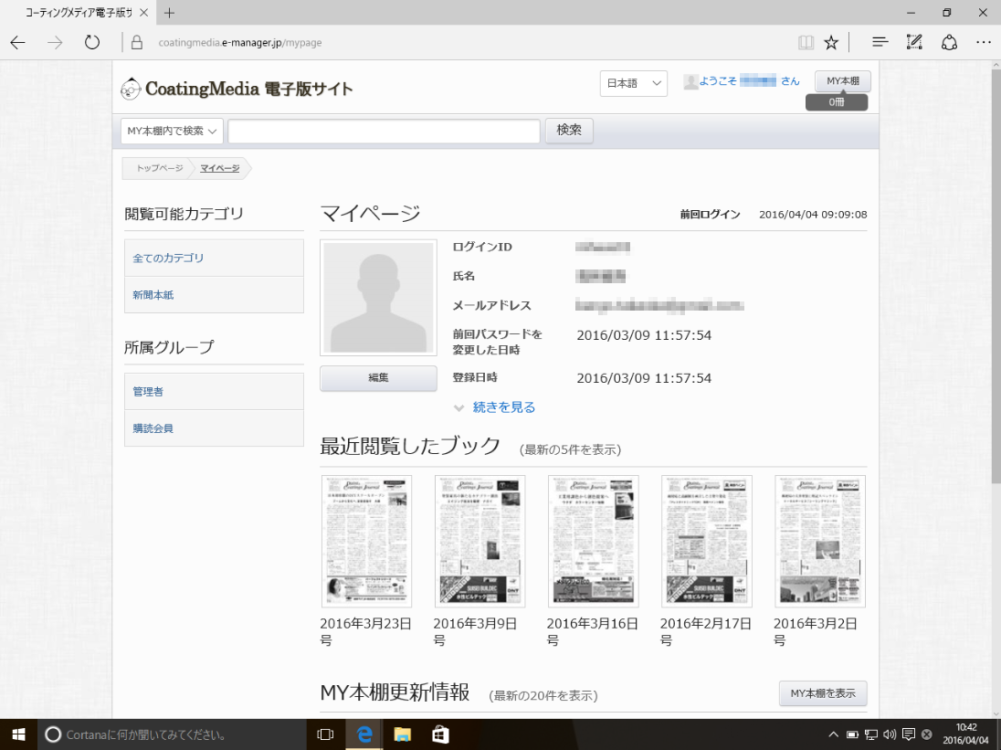 [マイページ]では、お客様の登録情報や最近閲覧したブックなどを確認できます。