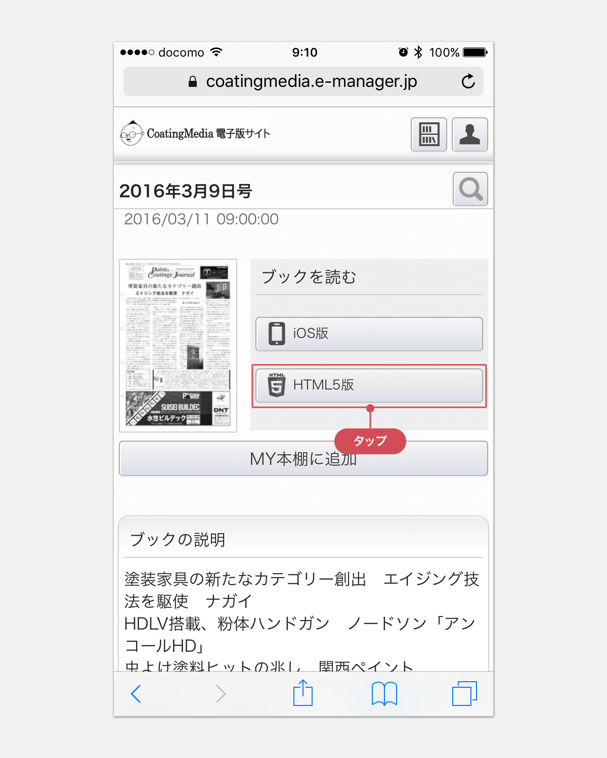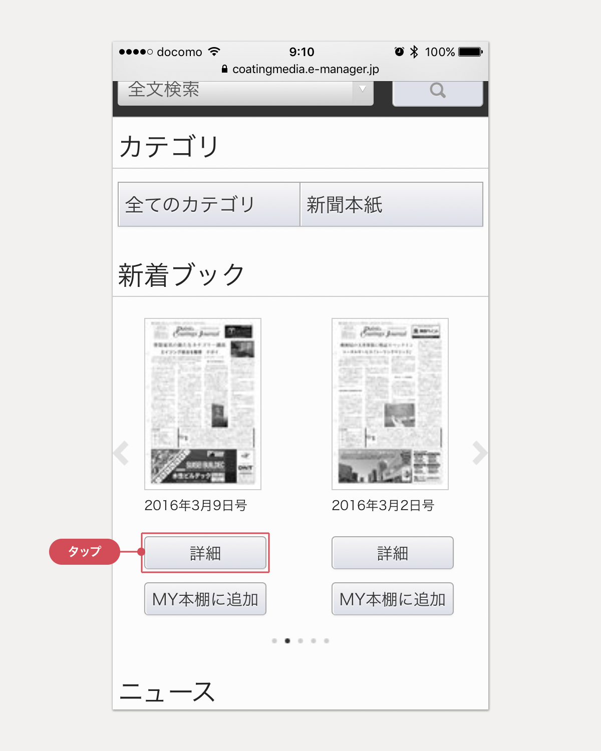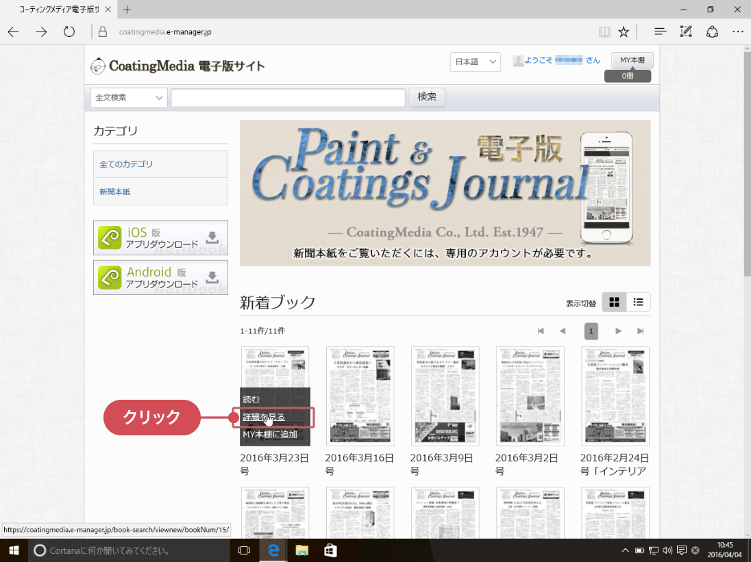 CoatingMedia電子版サイトにログイン後の新着ブックで、電子版のイメージ下の[詳細]ボタンをタップすると、その電子版の詳細情報を記載した画面が表示されます。