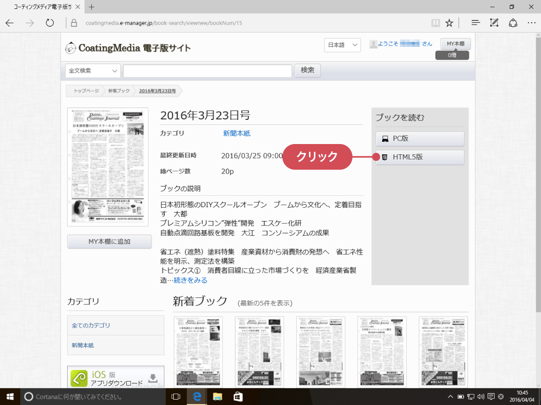 ログイン後の新着ブック欄には最新号を含むバックナンバーが表示されます。