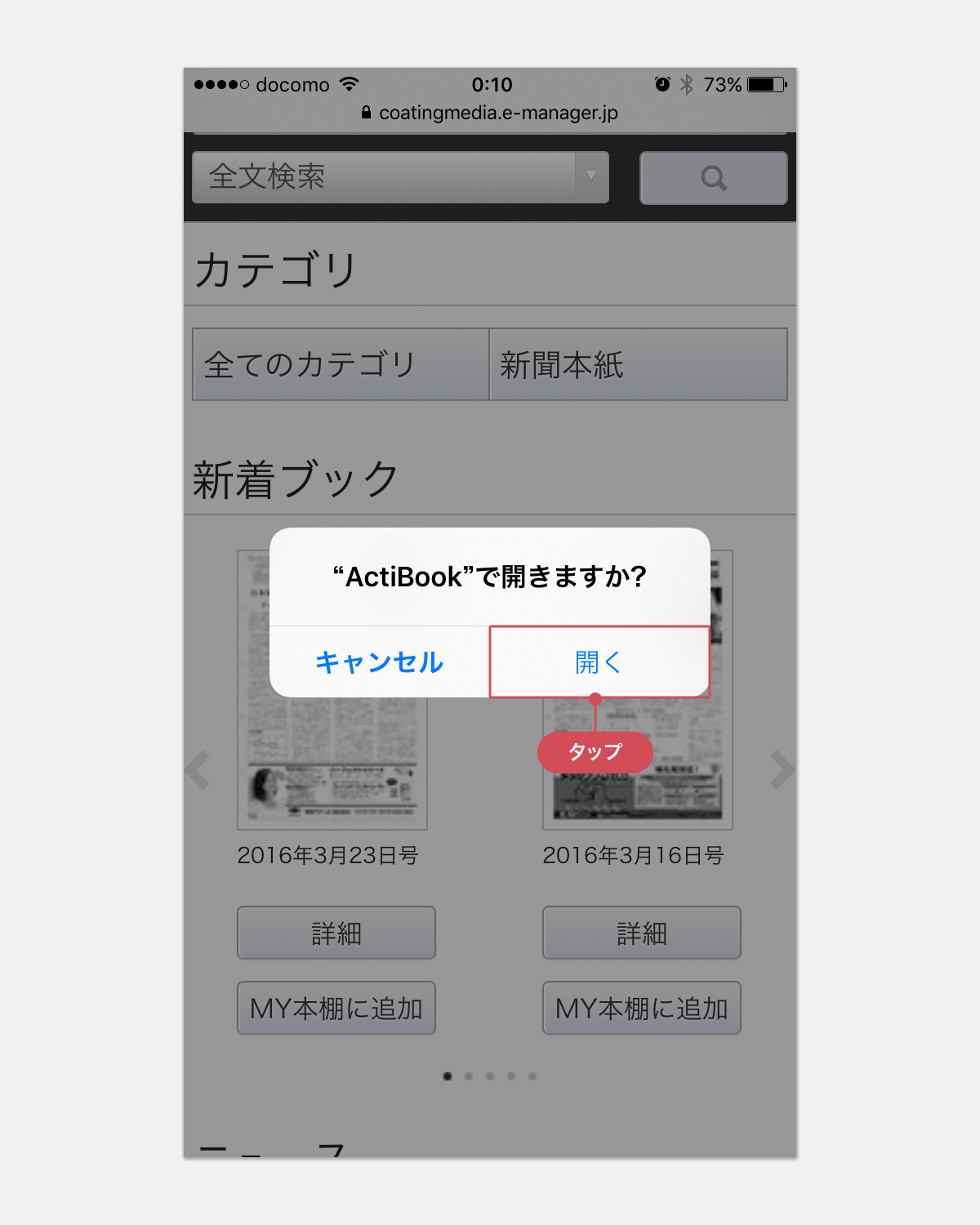 読みたい電子版のイメージの上をタップすると、「"ActiBook"で開きますか?」という確認ウィンドウが表示されるので、[開く]をタップします。
