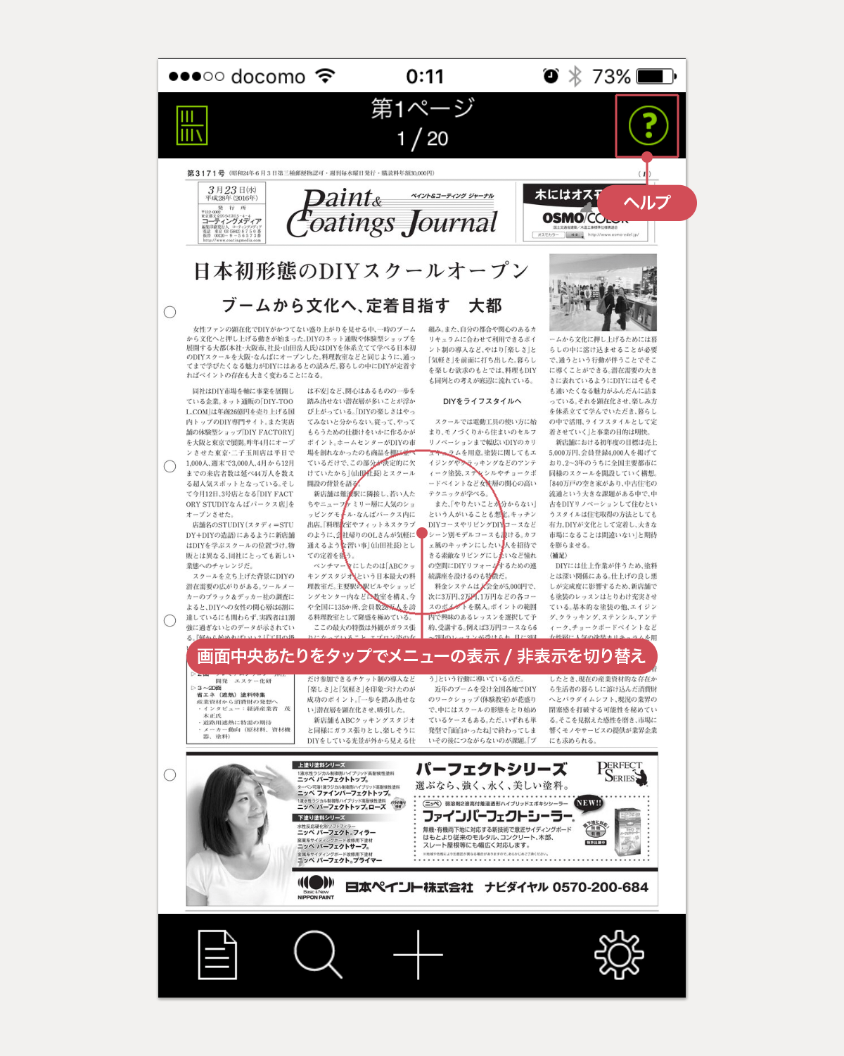 表示された画面の中央あたりをタップするとメニューの表示、非表示を切り替えられます。画面右上に[ヘルプ]ボタンがあります。アプリ内での操作方法については、ここで確認できます。