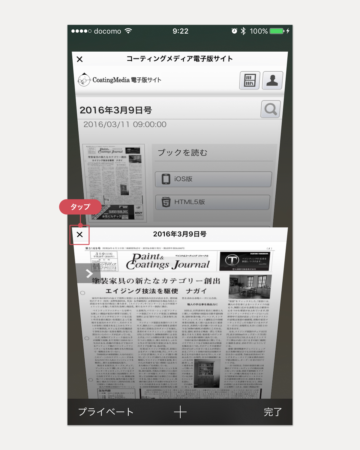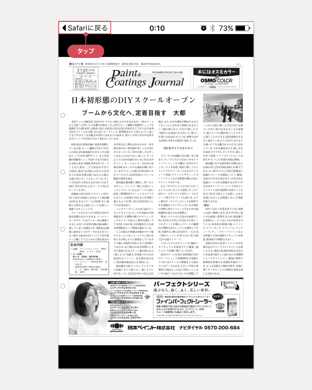 iOSの場合:画面左上の[Safariに戻る]をタップすると、アプリは終了し、電子版サイトにもどります。